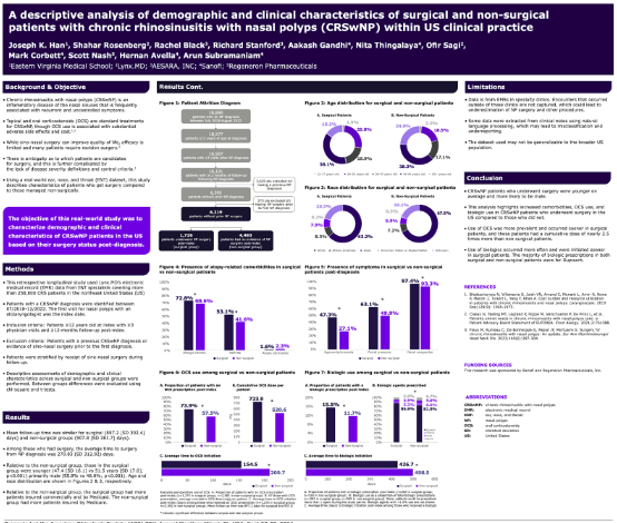 Conclusion: The study highlighted distinct differences between surgical and non-surgical CRSwNP patients in the US, with surgical patients tending to be younger and having more complex clinical profiles. This underscores the importance of personalized treatment approaches in managing CRSwNP